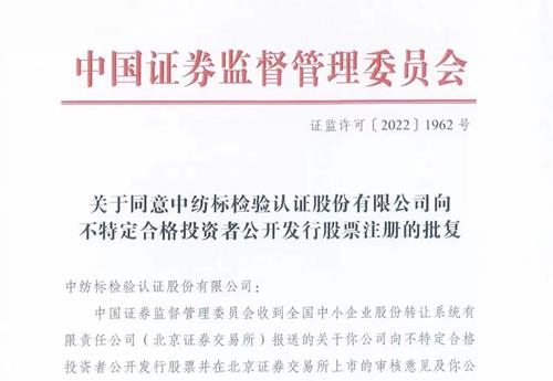 8月31日,據(jù)北京證券交易所官網(wǎng)公告,中國證監(jiān)會同意中紡標檢驗認證股份有限公司向不特定合格投資者公開發(fā)行股票的注冊申請。這意味著,中紡標登陸北交所再進一步,將在近期啟動股票發(fā)行。