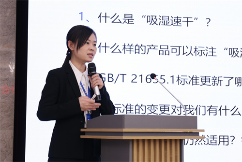 中紡標(biāo)檢測(cè)事業(yè)部技術(shù)主管、高級(jí)工程師、資深培訓(xùn)師鄭園園對(duì)吸濕速干類紡織品相關(guān)標(biāo)準(zhǔn)進(jìn)行了解析。她闡述了吸濕速干的原理及檢測(cè)方法以及該項(xiàng)目在GB/T 21655.1標(biāo)準(zhǔn)修訂后的主要變更內(nèi)容,在如何改善產(chǎn)品的吸濕速干性能方面給出了專業(yè)建議,并重點(diǎn)強(qiáng)調(diào)了功能性產(chǎn)品標(biāo)識(shí)的注意事項(xiàng)。